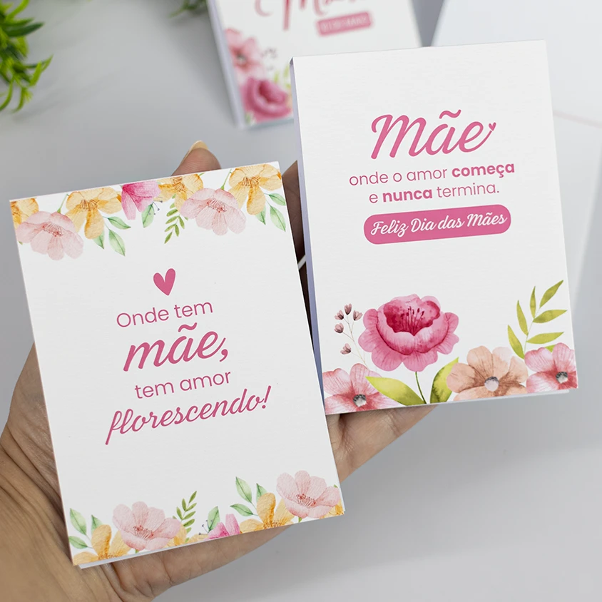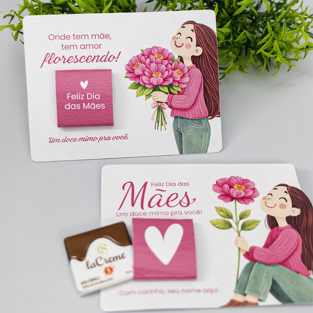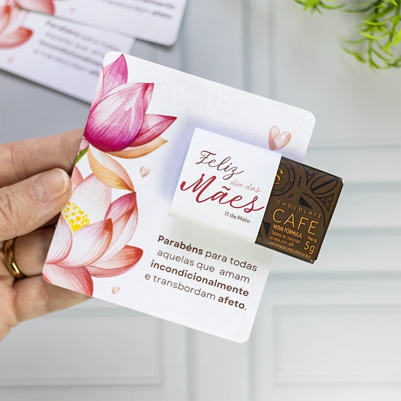 Um lindo card com mensagem significativa para o Dia das Mães. Acompanha mini tablete de chocolate da Cacau Show + embalagem transparente. Podemos incluir o logo da empresa ou nome de quem está presenteando.