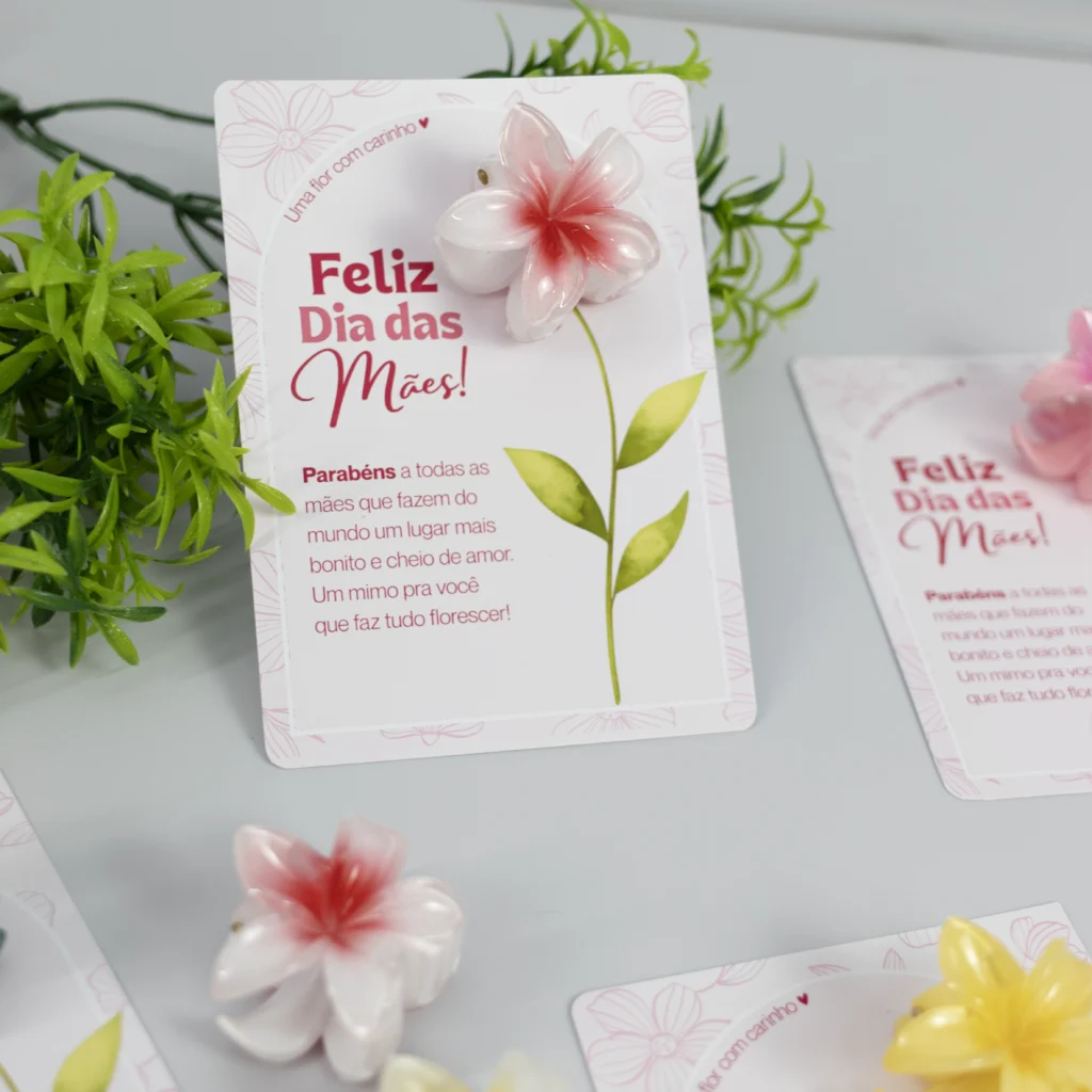 Card com mensagem delicada para o Dia das mães, acompanha uma presilha de flor na medida de 4cm, são em cores mistas. Podemos incluir o logo da empresa ou o nome de quem está presenteando no card + embalagem transparente.