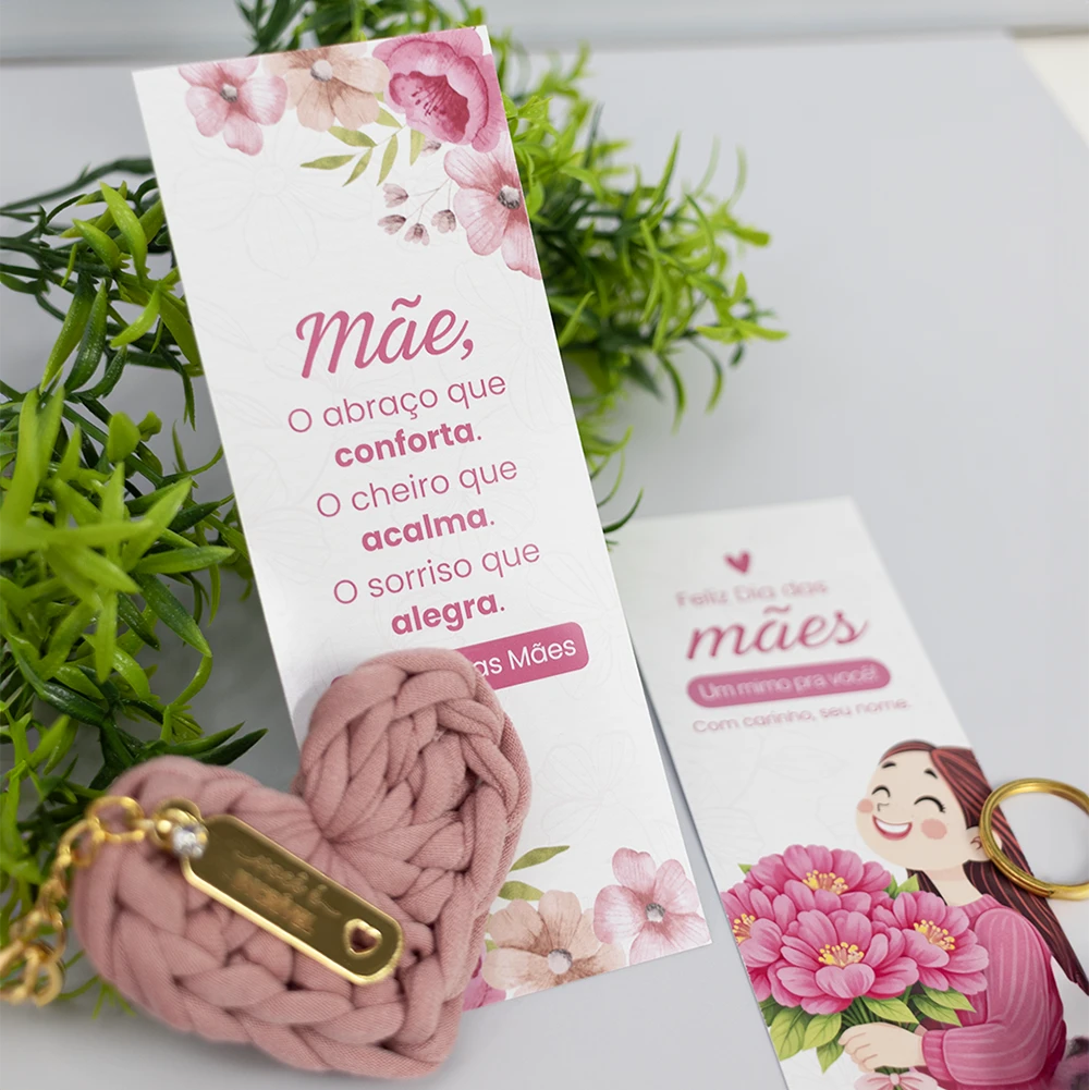 Um chaveiro feito à mão em formato de coração com fio de malha premium. Acompanha marcador de páginas onde você pode escolher o modelo + medalha dourada com opção "Você é incrível"ou "Feliz Dia das Mães".