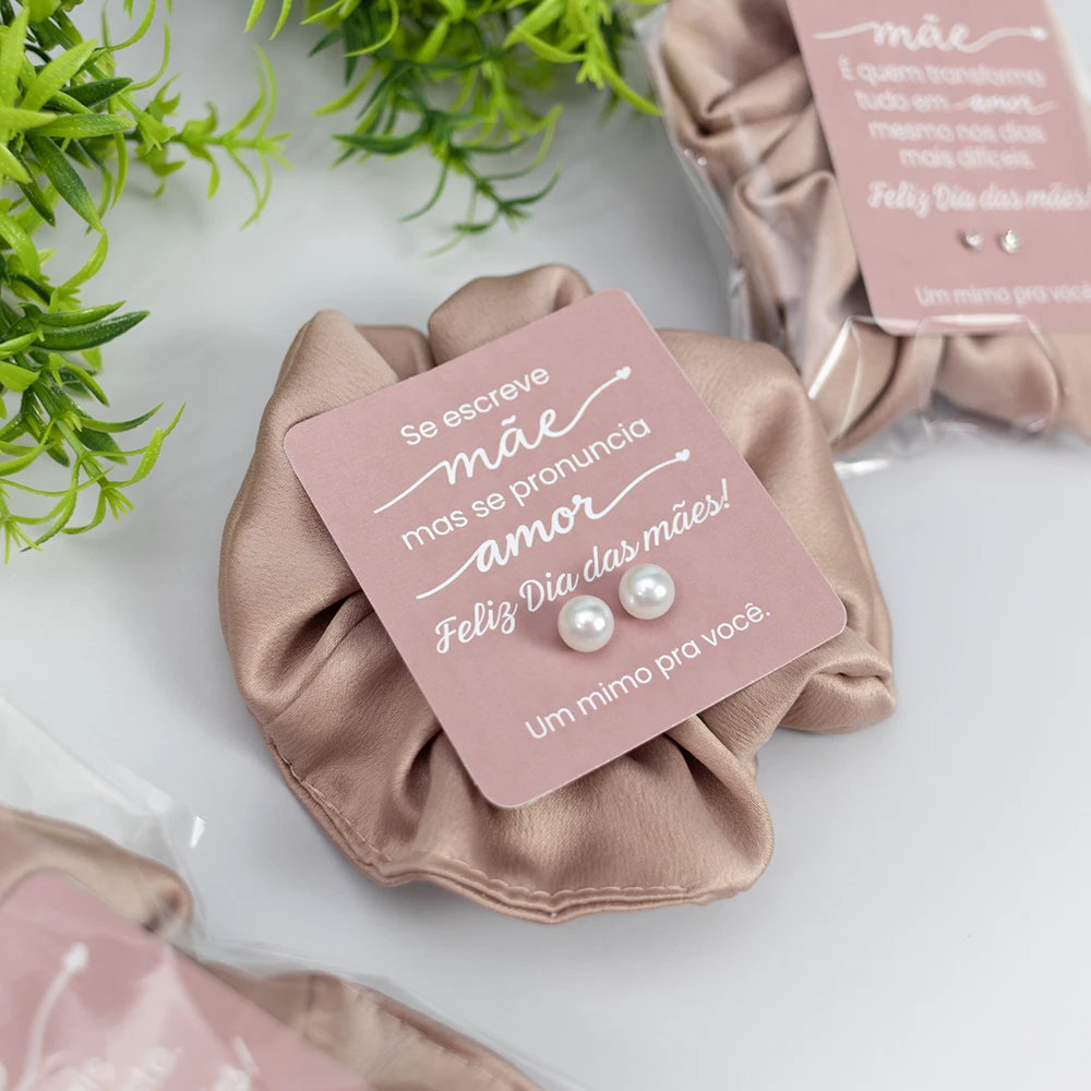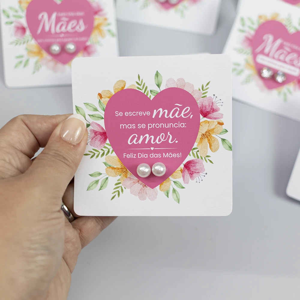 Um lindo mimo para presentear neste Dia das Mães. Nosso card personalizado contém um par de brincos de pérola no tamanho de 6mm. Podemos incluir o logo no card. Acompanha embalagem transparente.