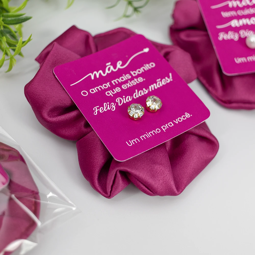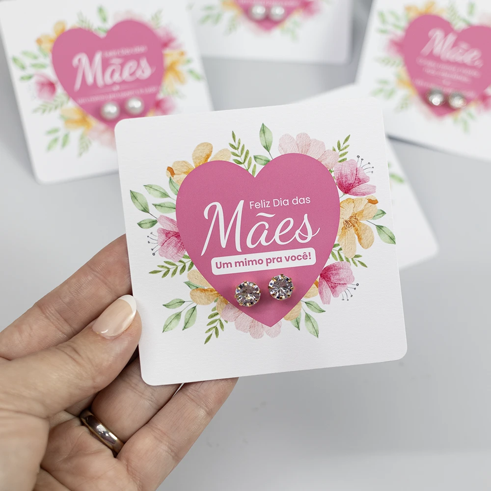 Um lindo mimo para presentear neste Dia das Mães. Nosso card personalizado contém um par de brincos brilhantes no tamanho de 8mm. Podemos incluir o logo no card. Acompanha embalagem transparente.