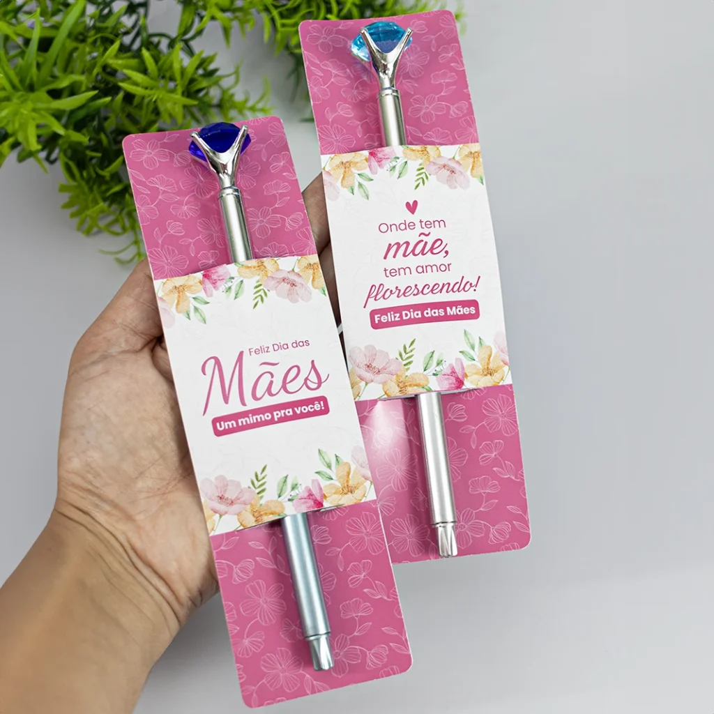 Lindo e delicado card com mensagem para o Dia das Mães que acompanha caneta diamante, com escrita na cor azul. Podemos incluir o logo da sua empresa abaixo da mensagem, acompanha embalagem transparente.