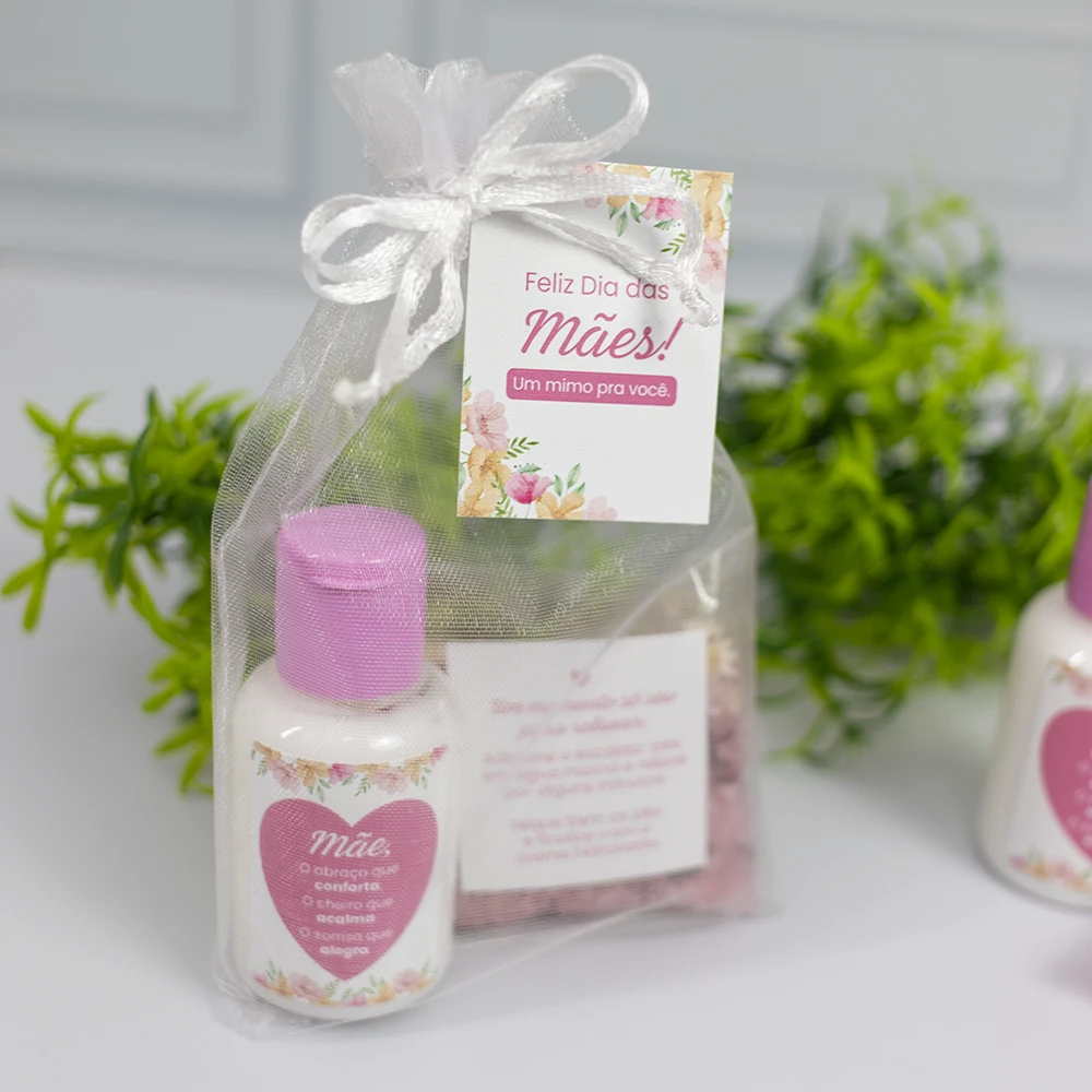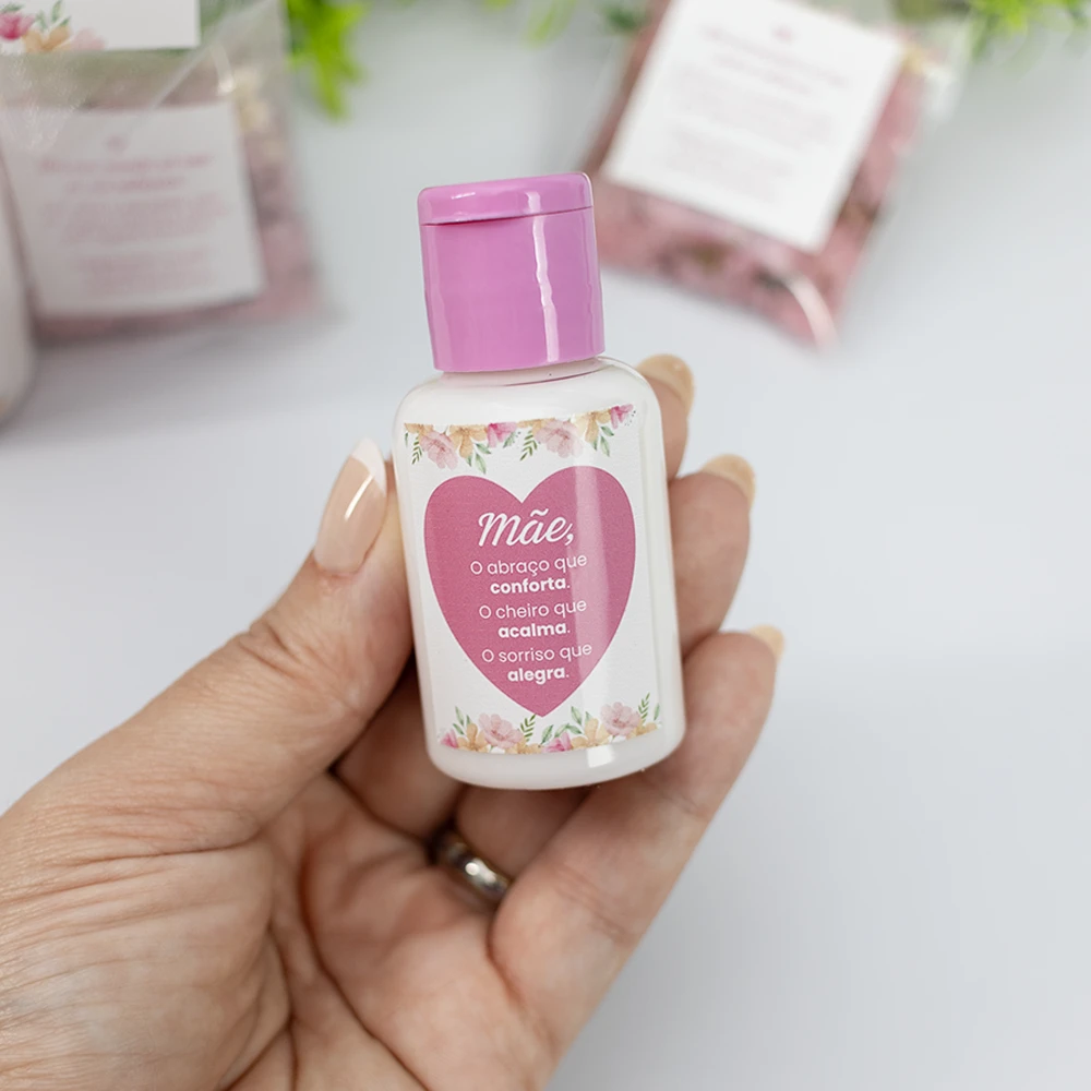 Hidratante personalizado com cheirinho de amêndoas. Todo personalizado com linda mensagem para as mamães, acompanha embalagem de organza. Podemos incluir o logo da empresa na tag por fora no saquinho.